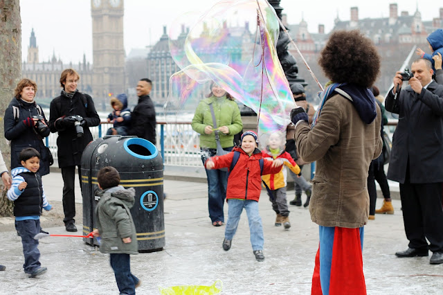Along the street lining the Eye of London, there were groups of performers and crowds of people watching the acrobats, singers, statue-men and the like.